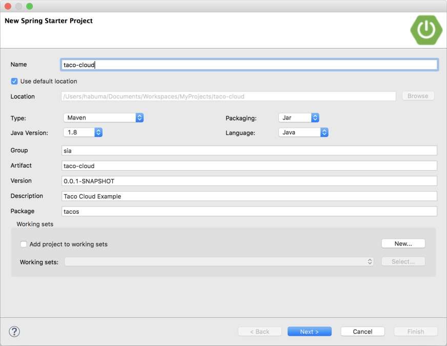 在选择Spring Starter Project之后,将会出现一个新的向导对话框(见图1.3)。向导的第一页会询问一些项目的通用信息,比如项目名称、描述和其他必要的信息。如果你熟悉Mavenpom.xml文件的内容,就可以识别出大多数的输入域条目最终都会成为Maven的构建规范。对于Taco Cloud应用来说,我们可以按照图1.3的样子来填充对话框。