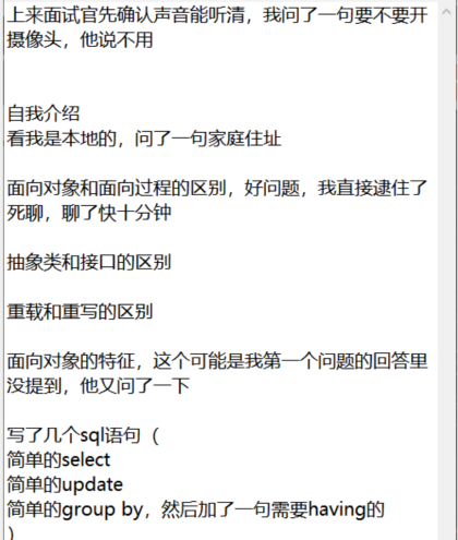 2021年08月27日 面经分享 发表于 2021-08-30 分类于 随堂笔记 , 2021年08月 , 笔记 Waline: 本文字数: 128 阅读时长 ≈ 1 分钟 面向对象和面向过程的区别抽象类和接口的区别重载和重写区别简单SQL语句JSP如何嵌入java代码 要说到,JSP最终转换为Servlet 企业云盘 如果有文件服务器,则存储到文件服务器,否则就存储到当前服务器的路劲。 Redis五个基本类型 字符串,哈希,列表,集合