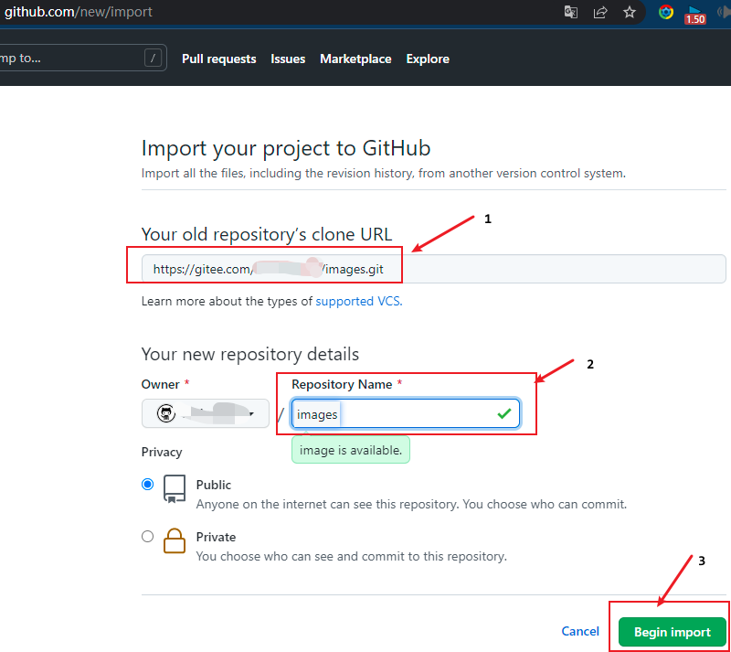 因为新旧图床的仓库名都是images,所以在github上导入gitee仓库时,不能再使用images作为仓库名,此时,更换一个仓库名即可。
