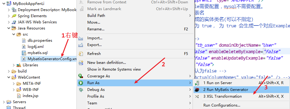Eclipse运行MyBatisGenarator 在MybatisGenarator的配置文件上右键,选择 Run As,然后选择Run MyBatis Generator即可。